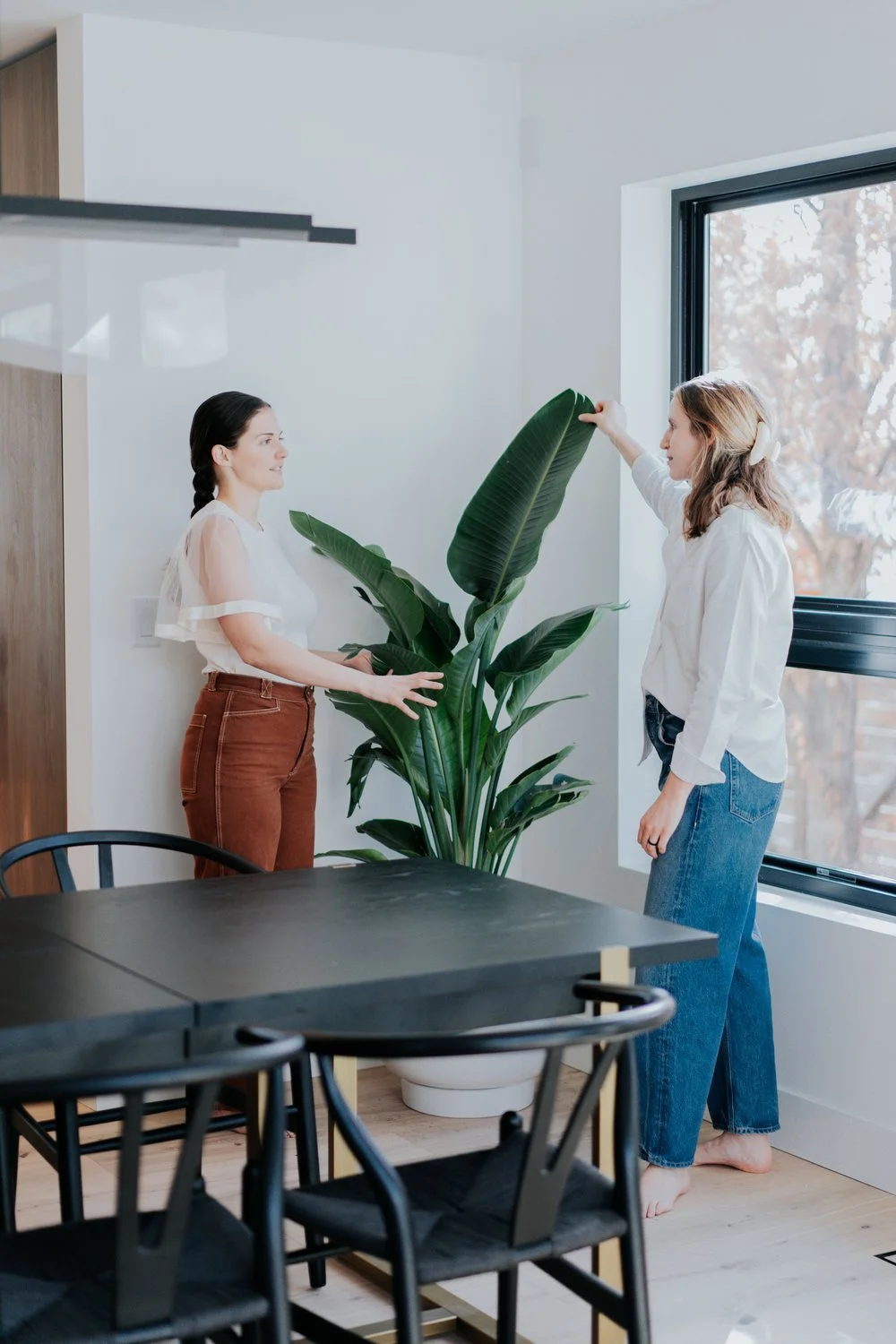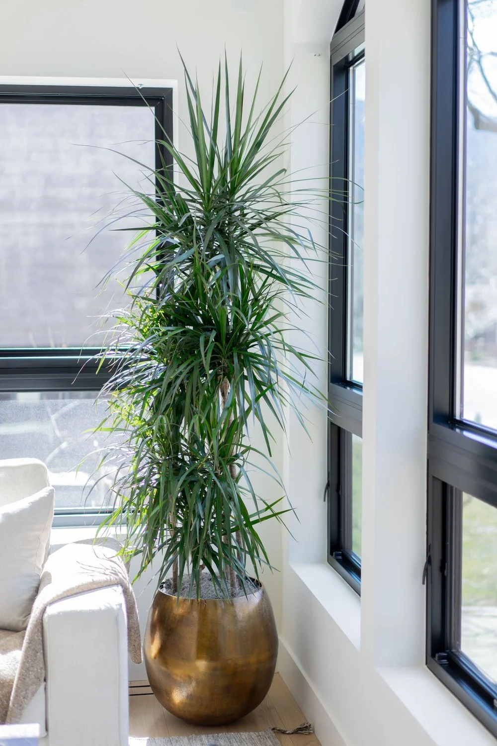 We recently brought Incrementum to style Newland’s House—a modern, open-concept home with a minimalist yet earthy ambiance. For the bedroom, their plant experts selected a Ficus Audrey, a stunning statement piece with soft leaf shapes and gorgeous gradient colors. For the dining area, a tropical Bird of Paradise was chosen to anchor the room with bold and sculptural greenery. For the living room, they placed a tall Dracaena Marginata that offered height, color, and texture in this cozy, gathering area. Each of these plants requires bright indirect sunlight to thrive, something the remodeled home provides.