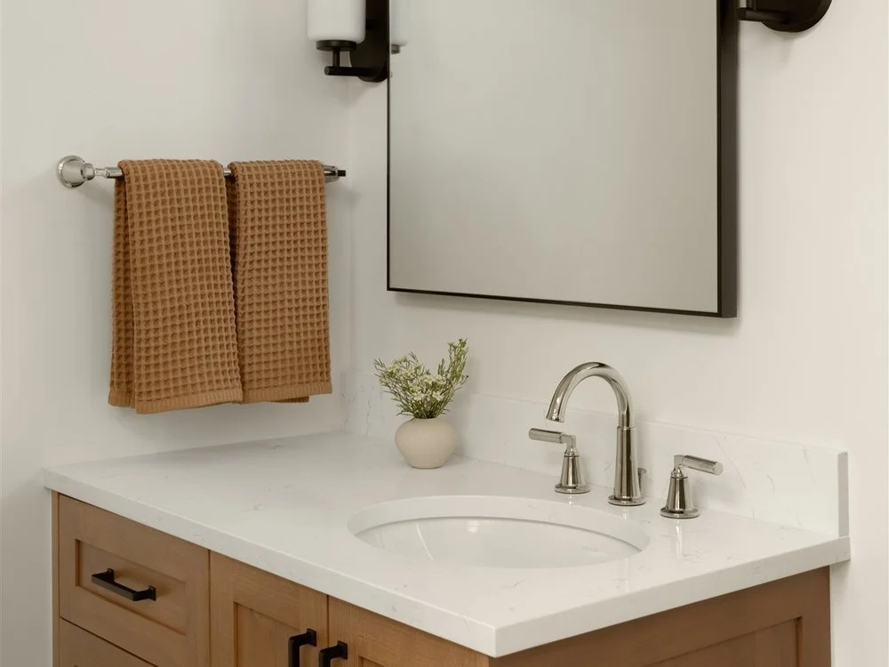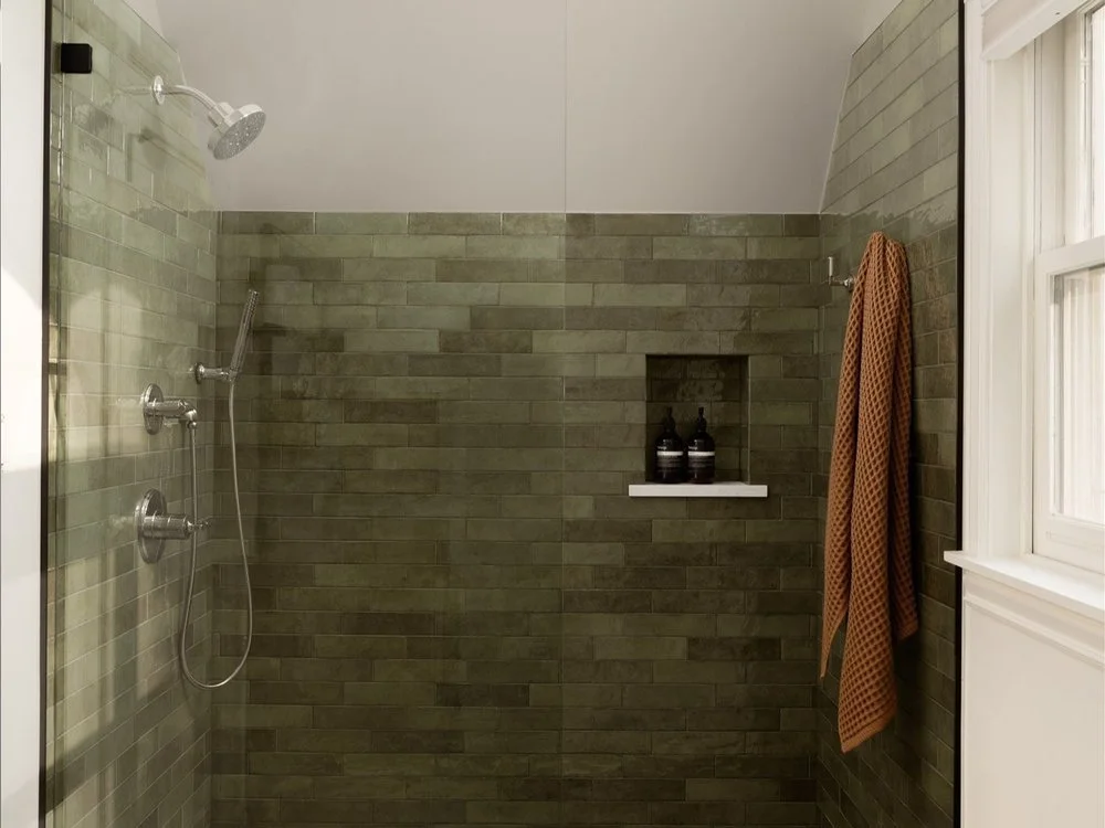 One of my trusted approaches to design is stacking colors together to create visual uniformity, which you can see throughout the design of the Bluff house. In the primary bathroom, we continued the theme of greens using a tile with high variants of color that extended up the walls to create a luxurious, spa-like moment. The orange undertones of the cabinetry gave warmth to the green for a beautifully balanced feel. In the primary and kids’ bathrooms, we used plumbing from Delta fixtures and glass splash panels from GCS Glass. Since we wanted to lean into the original character of the home in other rooms, we focused on the bathrooms being decidedly modern and transitional.