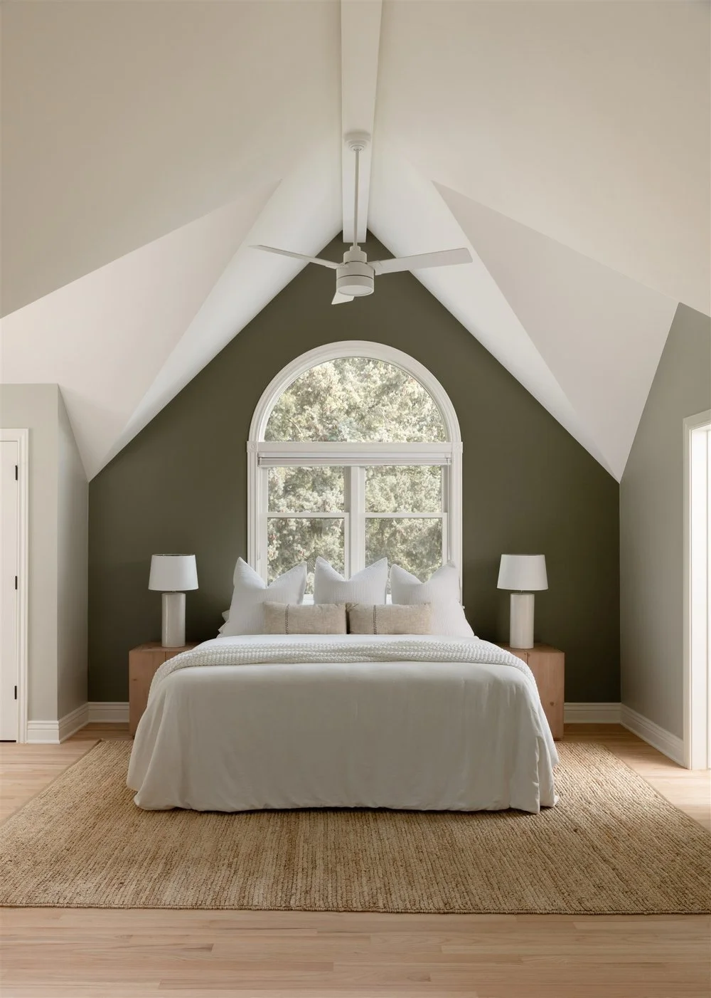 To celebrate the thriving wildlife around this beautiful Boulder home, we used gorgeous greens throughout to bring a nurturing ambiance indoors. We painted an accent wall in the primary bedroom to emphasize the vaulted ceilings and expansive arched windows. The cozy and brightly lit room feels like a luxury tree house balanced in the high branches of the surrounding firns and pines. In the kids’ bedrooms and bathrooms, we incorporated cool, blue tones that honored our natural color palette. The blue tile in the bathrooms complimented the herringbone tile flooring and the countertops that feature flecks of a similar blue to harmonize the whole space.