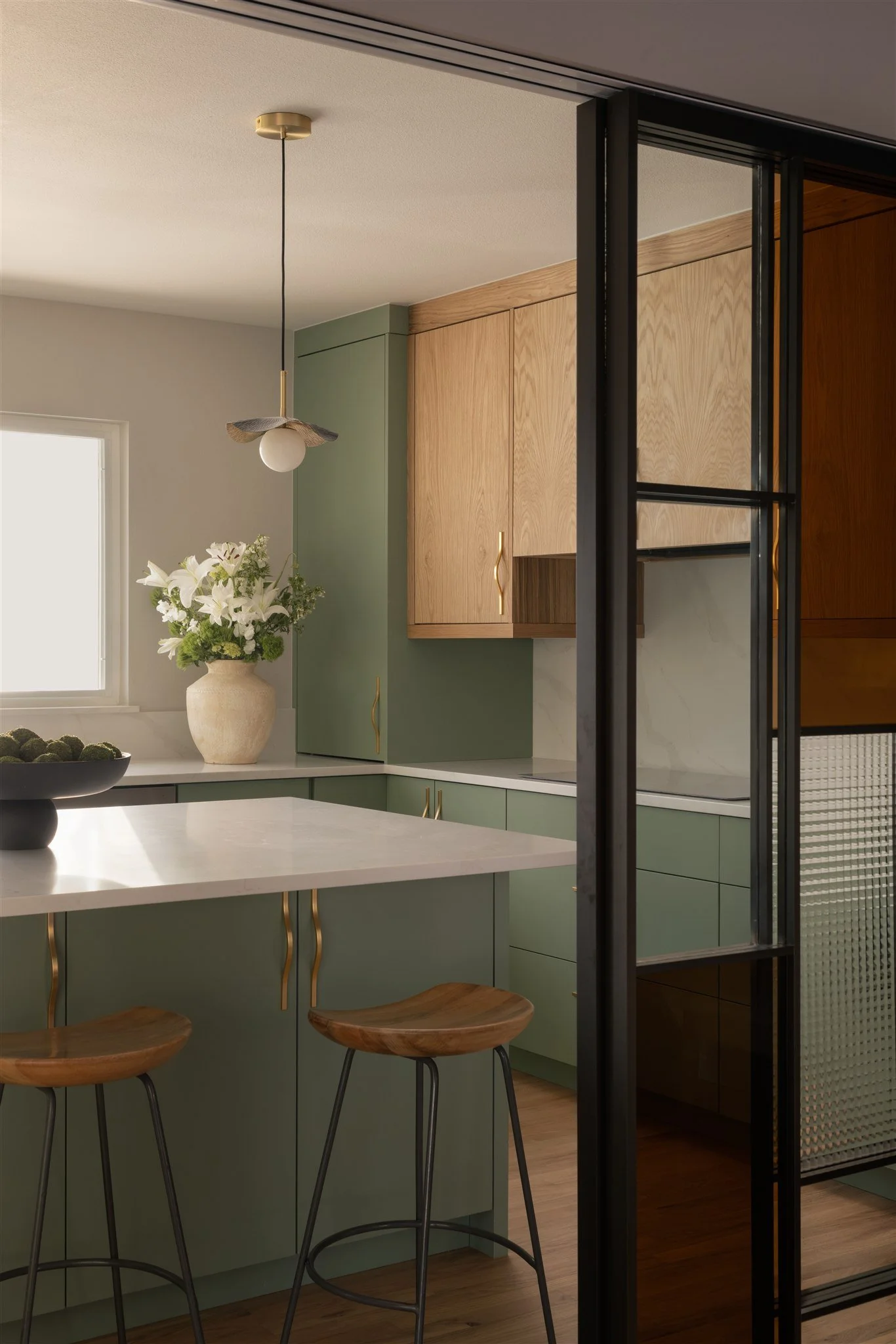 Designed in a Japandi-meets-cottage aesthetic, the kitchen balances warmth and minimalism with layered woods and soft greens. Appliance garages, ceiling-height cabinetry, hidden outlets, spice storage, pull-out trash bins, and a generous island ensure everything has its place. The dining and living spaces were reoriented to strengthen flow to the backyard, while a new genkan-inspired entry and custom mudroom cabinetry support their love of gardening.