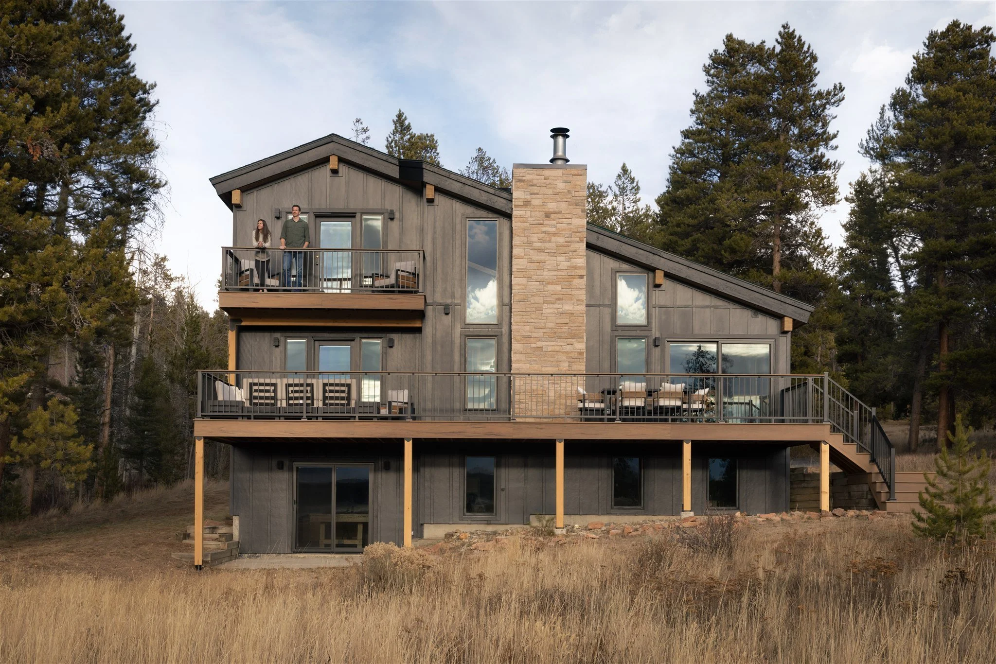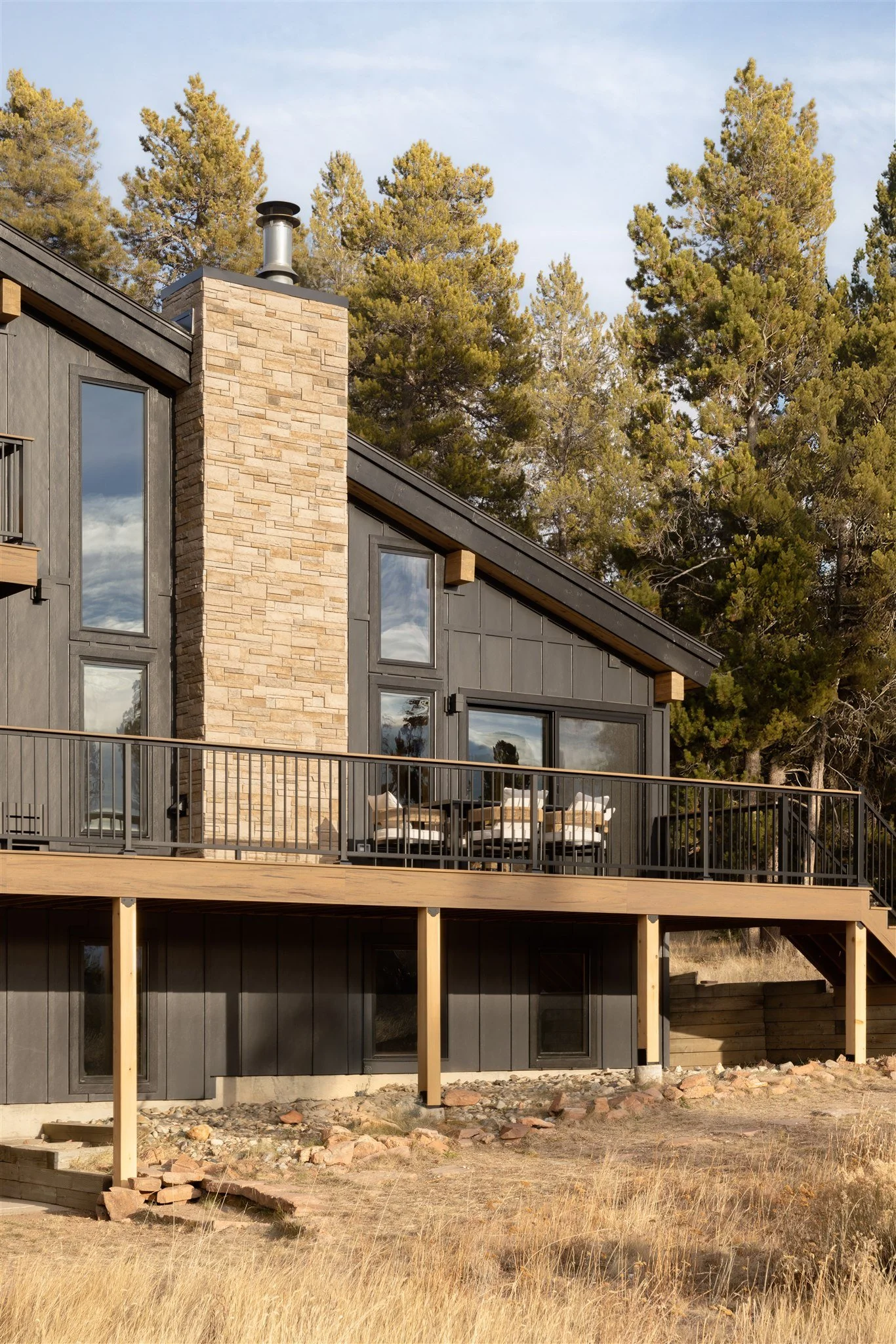 Durability was equally important. Mountain homes must stand up to heavy snow, intense sun, and fluctuating temperatures. We selected long-lasting, low-maintenance materials, including composite decking, to ensure the exterior performs beautifully for years to come.